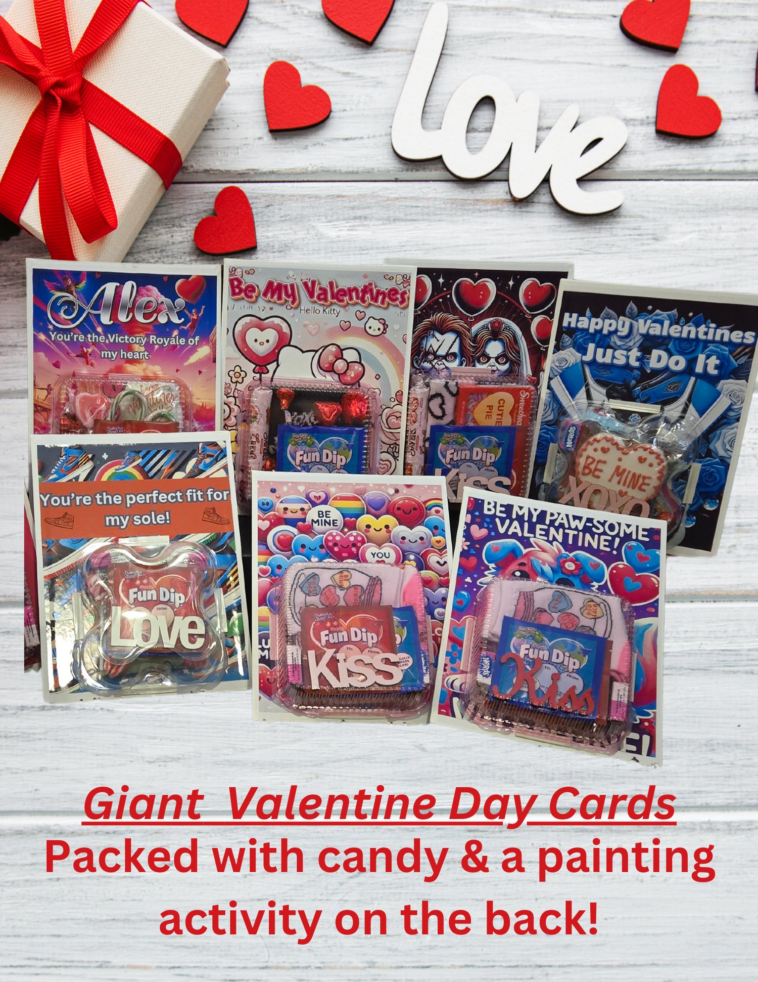 Giant Valentine Day Cards -Packed with candy & a painting activity on the back! custom made with names and favorite themes