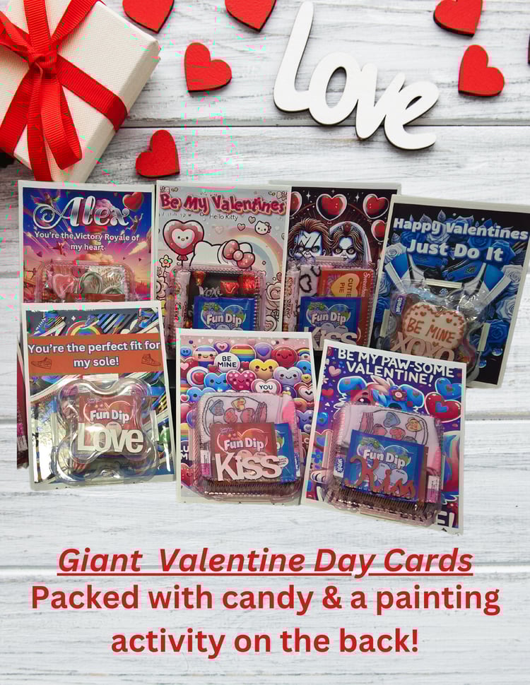 Giant Valentine Day Cards -Packed with candy & a painting activity on the back! custom made with names and favorite themes